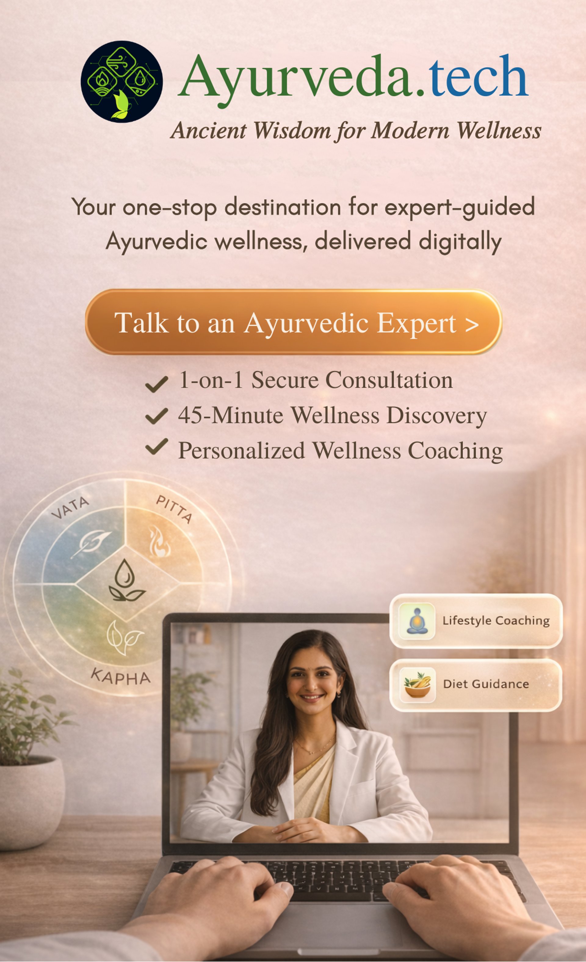 Disclaimer : Our consultations and recommendations are designed to provide holistic wellness guidance based on Ayurvedic principles. They are not intended to replace conventional medical advice, diagnosis, or treatment. Please consult with your primary healthcare provider before starting any new dietary, herbal, or wellness regimen. The information provided during consultations is based on Ayurvedic wellness principles and is aimed at supporting your overall well-being. These statements have not been evaluated by the Food and Drug Administration (FDA). Our services are not intended to diagnose, treat, cure, or prevent any disease. By proceeding with your consultation, you acknowledge and agree to the terms outlined above. This email and any accompanying attachments are intended solely for the use of the recipient(s) and may contain confidential and privileged information. If you are not the intended recipient, please notify the sender immediately by replying to this email and delete the original message. Any unauthorized use, distribution, or copying of this communication is strictly prohibited.